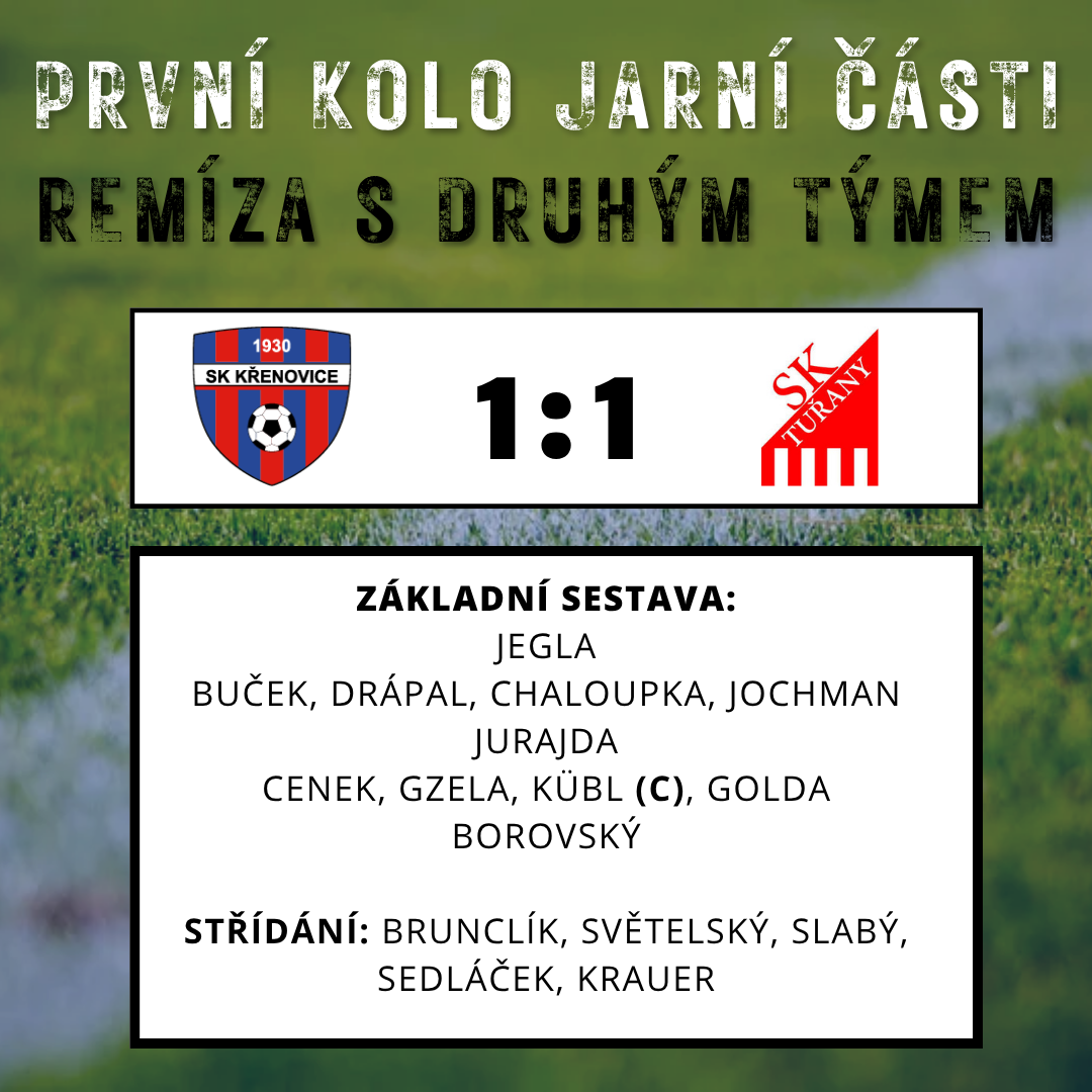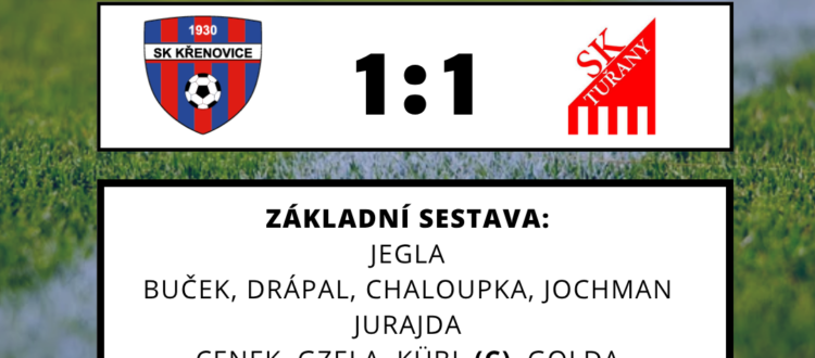 64.min Tuřaňák zakrótí rohové kopl, ten končí na zadní tyči!! 67.min dalekonosné centr se snáší na malé čtverec, stoper Fylďas Chaloupka svým nepovedeným vodkopem nande náruč Koubyča. 71.min trma-vrma v našom malým vápně, tuřanská gólofka, skákající mičudu si nande Tuřaňák v malém čtverci, střihne čapó, metr nad našu kasu!! Uf!! 87.min naša defenziva vodrazí dalekonosné přímák jen na šestnáctku, vodkaď hostující fík nabuří mičudu dolů k tyči. Druhé polčas nás Tuřany valily. Ale až pozdní gól uzavřel skóre utkání. Veliká škoda!! Celé mač Křenda zdárně odolává, zdárně drží nulu, až pak pozdní gól stanoví dělbu bodů. Ach jo!! No co už fčyl?? Je to smůla, ale za téden bude další šanca urvat body. Křenda totiž vyrazí zabojovat o body k nebližšímu sópeřovi sezony, což je 13 kiláků vzdálená dědina, Podolí u Brna /SO 14.00/. Podolí je nováček sezony, loni spadlo z I.A třídy.